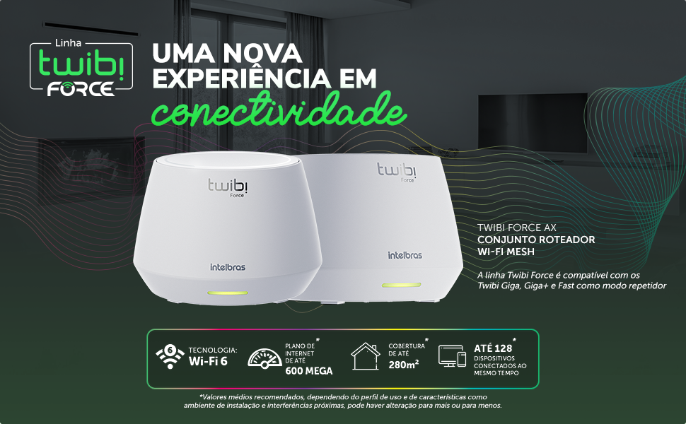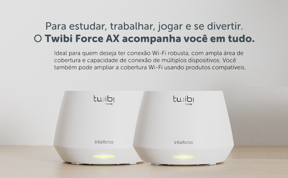 - O Conjunto Roteador Wi-Fi Twibi Force AX é ideal para quem deseja ter conexão Wi-Fi robusta, com ampla área de cobertura e capacidade de conexão de múltiplos dispositivos