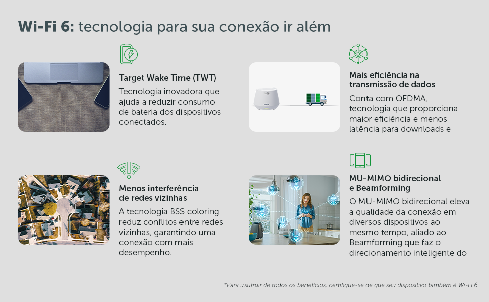 - OFDMA: tecnologia que proporciona maior eficiência e menos latência para downloads e uploads simultâneos, sendo ideal para a conexão de múltiplos dispositivos com qualidade